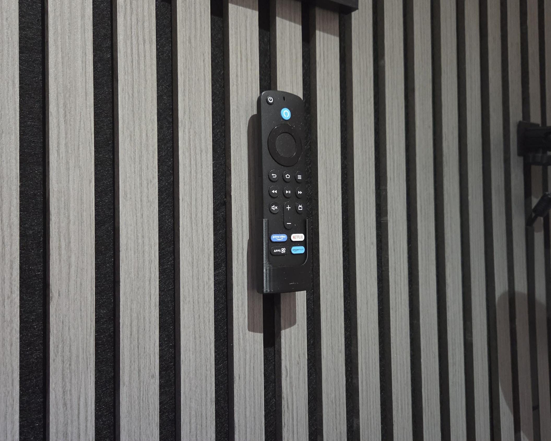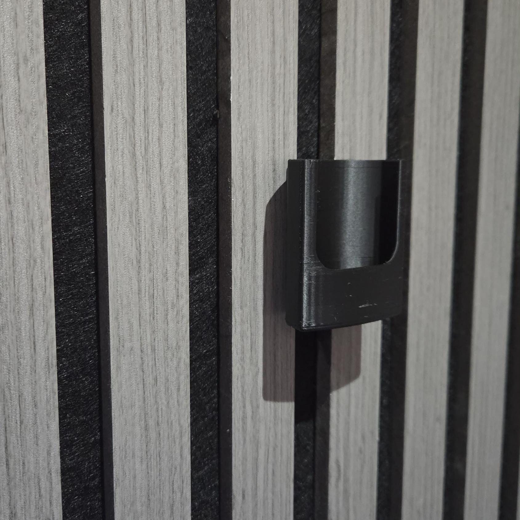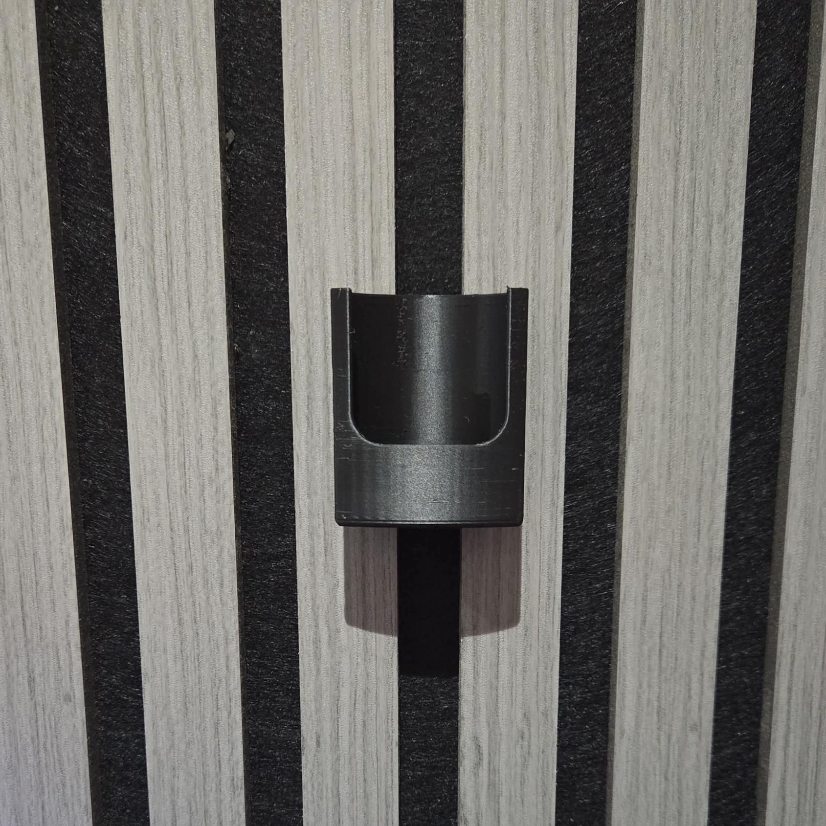 Printed on my Bambulab x1c printer in high strength PLA it's designed for a twist fit through the slats in your acoustic panels (no drilling or screws) to secure the remote holder in place